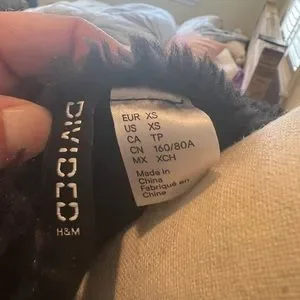 H&M fuzzy little jacket. Light, but fluffy. Slight shimmer in the fabric. Size is xs. It’s a little short on my wrists, but that’s what I wanted, so my bracelets would show. Hook and eye closer in the upper middle front in case ya get chilly.