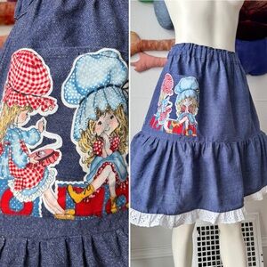 Amazing rare vintage 1970’s winter jacket. The shell feels like velveteen in dark blue. Trimmed with patchwork-printed quilted fabric & piping. White acrylic faux fur. Metal zipper. Original belt! Nice thick quilted & insulated lining. Big hood.