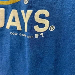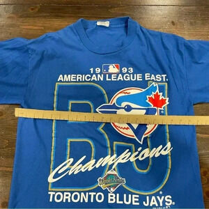 Toronto Blue Jays 93’ American League Champions T-Shirt * Shirt may have some stains/patina from previous use, might have colour fade - which adds to its natural distressing. Beauty addition to anyone’s wardrobe!! Sizing: (Approx) Mens: Large * see pictures for details Inventory: T20