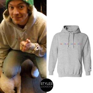 Harry Styles Champion hooded sweatshirt with rainbow embroidery on the front.