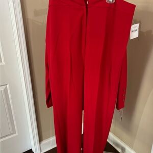 This striking red pantsuit from Zac & Rachel features a tailored blazer with notched lapels and matching slim-leg pants. Crafted from a structured fabric, it offers a professional yet bold look, perfect for formal occasions.