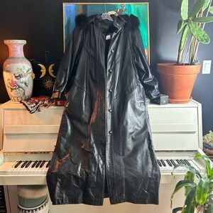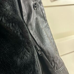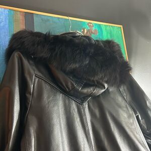 Step out in style with this elegant black leather hooded coat. Its sleek design and luxurious feel make it a must-have for any wardrobe. Zip faux fur lining. Beautiful soft leather.