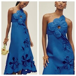 NWT Anthropologie One-Shoulder Cutwork Cutouts 3D Flower Blue Midi Dress