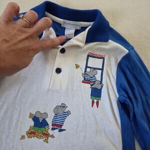 Vintage Oshkosh blue and white long sleeve collared shirt with mice piling up cheese on front! Please see all photos for condition and measurements