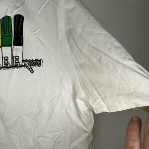 Light wear overall. No holes or rips. Has some yellow stains on the armpits and a yellow mark on the bottom of the shirt. Flaws are shown in the photos. Please look at every picture.