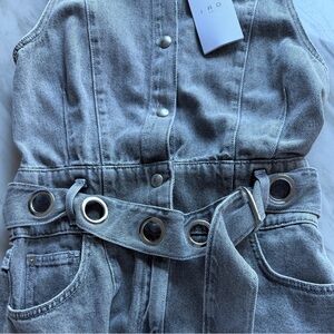 Stylish gray denim sleeveless romper perfect for casual outings. Features a belted waist for a flattering fit.