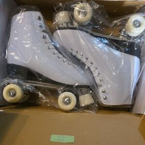 Stylish white roller skates with durable wheels. Perfect for skating enthusiasts. Brand new never worn.