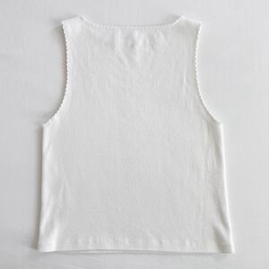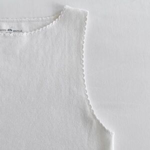 A classic ribbed tank with a feminine twist, featuring a high neckline and delicate ruffled edges at the neck and sleeves. Crafted from soft 100% cotton for a lightweight, breathable feel. Perfect for layering or wearing on its own.