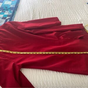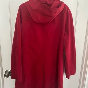 Classic trench coat in bold red. Features sleek design and button closure. Perfect for stylish outings.