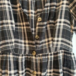 Step out in style with this elegant black plaid midi dress. Featuring a button-down front and charming tie sleeves, it's perfect for any casual occasion.