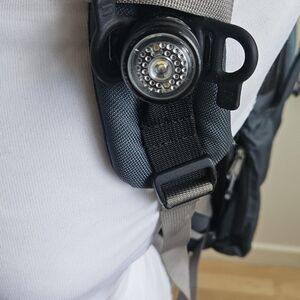 Many pockets, clear ID/permit holder, attached flashlight on shoulder strap.