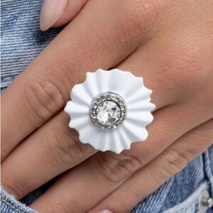 NWT Paparazzi silver-pronged border of fuchsia rhinestones, an oval UV shimmery gem glistens atop. Hypoallergenic, lead & nickel free. Stretchy band. Size 6-10. Last One!!