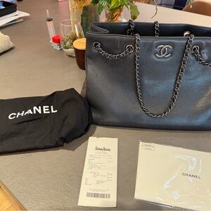 Timeless CHANEL shoulder bag in luxurious black leather. Features classic chain straps and signature logo. Perfect for any occasion.