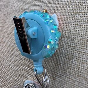 Handmade unicorn badge reel with blue rinestones on alligator clip