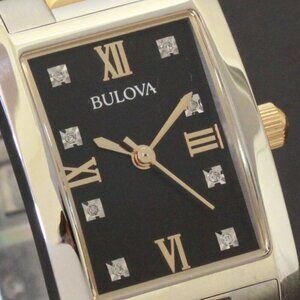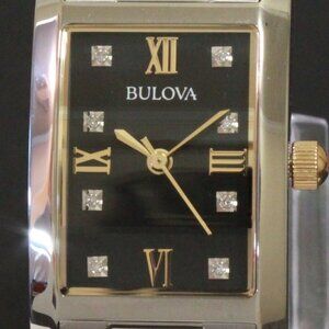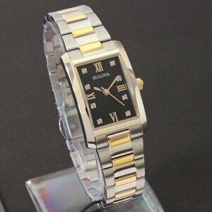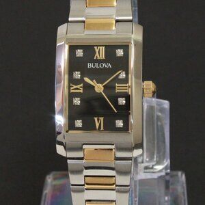 Fabulous ladies tank style watch from the Diamond Collection by Bulova. This beautiful two tone watch featured a black radiant dial, Roman numerals at 3, 6, 9 and 12 and the eight diamond indices for the rest. Its a two tone stainless case and bracelet with butterfly clasp. This elegant and easy to wear timepiece features a battery powered quartz movement. Fits wrist sizes up to 7 1/2”, is new in box and works as it should.