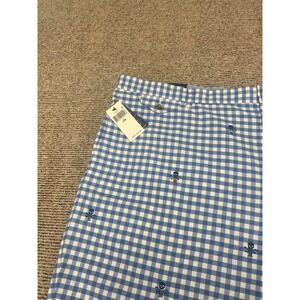 The Polo Ralph Lauren Classic Fit Gingham Plaid Skull Embroidered Shorts in size 52B are a stylish and unique addition to any man's wardrobe. Made from cotton with a light fabric wash, these shorts feature a classic fit and flat front design. The blue plaid pattern with skull embroidery adds a touch of designer flair, perfect for casual occasions in any season. With a zipper closure and pockets for convenience, these shorts offer both style and functionality for the modern gentleman.