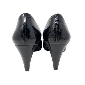Heels have a shiny black glossy finish and a pointed closed-toe style.