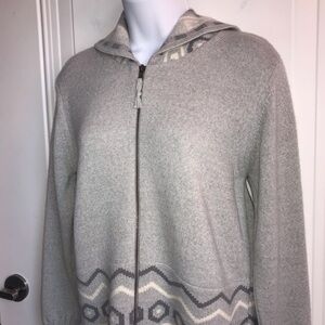 Women’s ACHEGA Portugal Brand gray & white Hooded Aztec Tribal print thicker full zip up heavyweight wool & acrylic blend sweater in estimated size medium in excellent pre-owned condition. Made in Portugal 🇵🇹