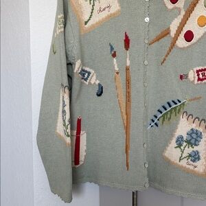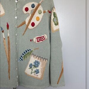 VINTAGE 90S TALBOTS GREEN PAINT ART PAINT THEMED KNIT CARDIGAN SWEATER WOMENS PM