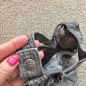 Boutique European brand. Light denim like material but not stiff like denim so very baby friendly. Really cute details like real pockets on the back.