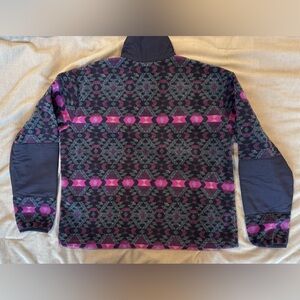 Cozy Columbia fleece pullover. Features a purple and navy blue vintage-like pattern. Perfect for warmth and style. Woman’s size large.