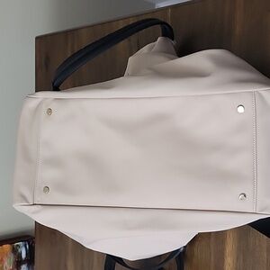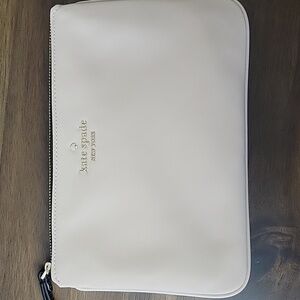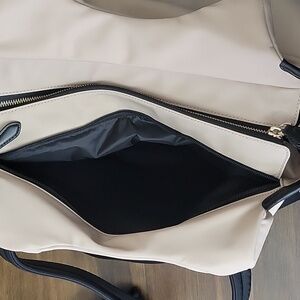 Stylish Kate Spade diaper bag with matching accessories. Cream body with black accents, carry handles, and shoulder strap. Lots of pockets inside and out and. Matching wallet.