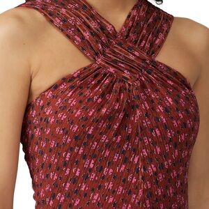 Chic garment with deep red and pink hues. Perfect for fashionable events. KATE SPADE NEW YORK FLORADOODLE DRESS - SIZE 2 This stunning Kate Spade dress features the signature "Floradoodle" floral print: Design Details: - Beautiful rust/brown base with pink and navy floral print - Elegant twisted crossover neckline - Sleeveless design with twisted crossover back detail - Fitted bodice with smocked waist detail - Flowy midi-length skirt with tiered hem - Back zip closure - Fully lined with burgundy lining Condition: New without tags - never worn Size: 2 Fabric: Cotton (lightweight and breathable) Print: Kate Spade's signature "Floradoodle" pattern Construction Details: - Beautiful twisted crossover front and back details - High-quality Kate Spade craftsmanship - Contrast burgundy lining adds luxury touch - Perfect midi length for versatile styling Styling: Perfect for brunch, date nights, garden parties, or any special occasion. The timeless floral print and flattering silhouette with pocket