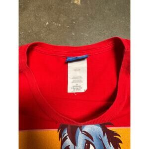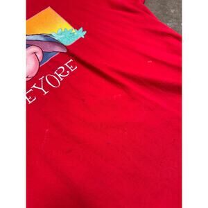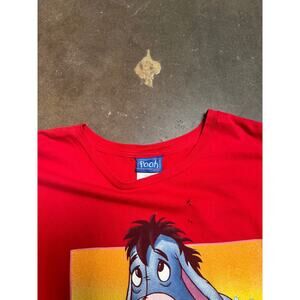 Step into nostalgia with this vintage 90s Disney Eeyore T-Shirt featuring a vibrant double-sided print of everyone’s favorite gloomy donkey from Winnie the Pooh. This bold red tee showcases classic artwork on both the front and back, making it a standout addition to any Disney or cartoon lover's wardrobe.