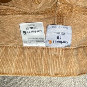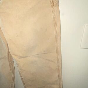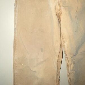 Basic khaki cargo straight leg jeans by Carhartt. Versatile tan color, has wear (marks pictured) and some flaws in the details, but still ideal for everyday wear. 100% cotton