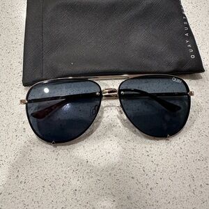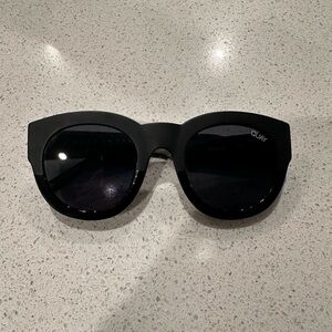 Chic black sunglasses by Quay Australia. Includes a textured cream case. Minimal scuffs that are not noticeable when wearing
