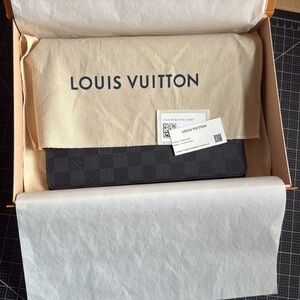 Includes: Agenda cover, gift box, dust bag, gift ribbon, tissue, LV original style number sticker and QR code tag. Orange paperwork envelope has slight oil mark in left upper corner as shown. Doesn’t affect agenda at all and will be bagged apart from other items.