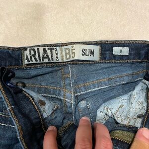 Pair of Boys Ariat B5 slim fit jeans. Size 8. Durable blue denim with stylish stitching - 2 different washes/pocket design. Adjustable waist. Excellent gently used condition - only worn a handful of times.