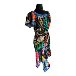 Turn heads in this stunning Flying Tomato off-the-shoulder dress featuring a ruffled neckline and asymmetrical high-low hem. The vibrant tropical print makes it perfect for vacations, parties, or sunny days out. Though the belt is missing, it doesn’t affect the fit or fabulous style of this piece.