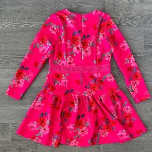 Vibrant pink mini dress with floral pattern. Long sleeves and fitted waist. Perfect for any occasion.