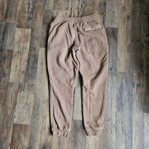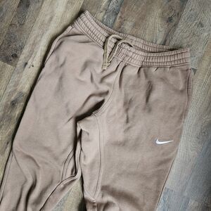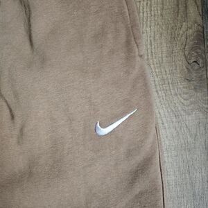 Brown/tan jogger pants featuring a white embroidered Nike logo. Comfortable fit and perfect for casual or athletic wear. In great used condition.