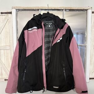 Women’s Snowmobile FXR Ranger Jacket and Liner. Removable, adjustable hood, hook, and loop adjustable cuffs with thumb hole, removable liner, reflective, inserts, vents, very warm. Black, blue, and pink.