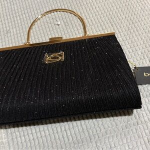 Chic Bebe clutch with a textured black finish. Elegant gold handle and logo detail. Perfect for evening wear.