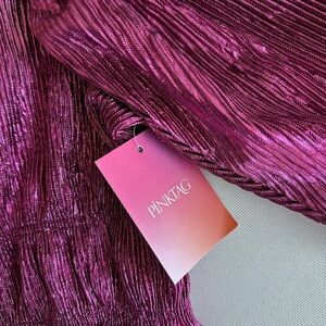 Metallic pink one-shoulder ruched crop top. Expertly crafted in crinkle textured satin, this top features a single shoulder detail, a stretchy elastic waistband, a cropped fit, and a ruffled hem. Dramatic balloon sleeves, a metallic shine, and sparkling accents inject a touch of luxe, making this top an exquisite addition to your wardrobe.