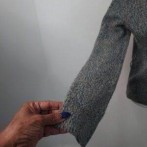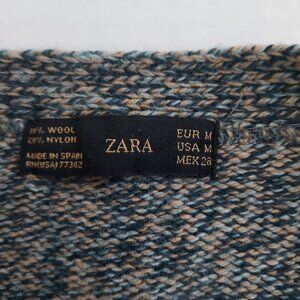 Size medium Zara ribbed Wool Open Long Sleeve Cardigan. 80% wool 20% nylon. Blue/cream color. Belt sash missing but could be worn with any leather belt. Falls slightly below the waist. Pit to pit 19” Length 22.5” Still in very good pre-owned condition.