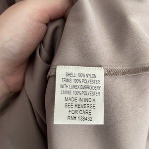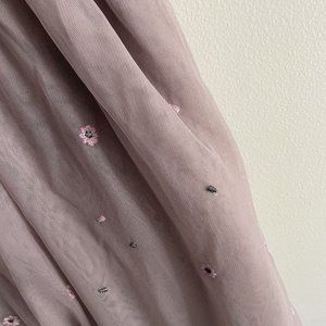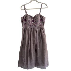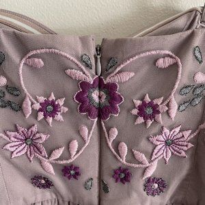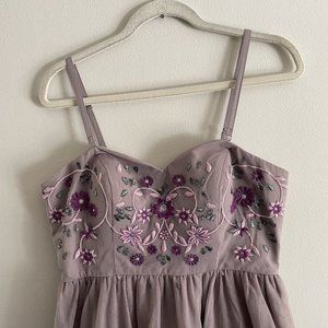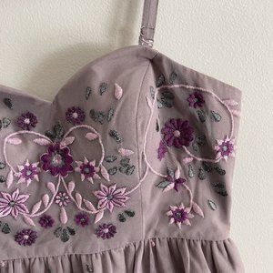 Charming lavender midi dress. Features floral embroidery. Sleeveless with a fitted bodice. Perfect for special occasions.