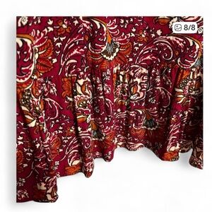 Stylish dress with intricate patterns. Features bold red and orange hues. Fun neck opening, flirty skirting at bottom and gold buttons in back add character to this dress. Would make a great dress to wear to a fall wedding with some funky shoes. Go from work and out in this dress