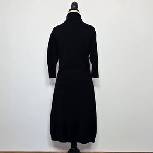 Chic black dress with 3/4 sleeves. Features a stylish turtleneck and waist tie. Perfect for versatile wear. I wish this photographed better on the mannequin. It's gorgeous in an understated way. Both the neck. cuffs and hem are ribbed, the rest is just regular knit.