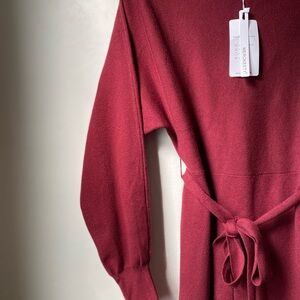 New with tags! Gorgeous wine red ribbed knit sweater dress with a soft, stretchy fit and removable belt. Flattering off-shoulder neckline — perfect for fall outings, date nights, or holiday parties.
