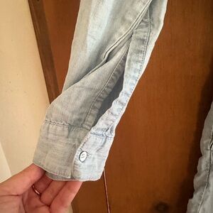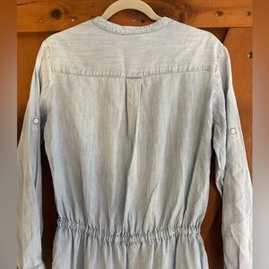 Dress is preowned but in perfect condition. Adorable, comfortable jean/chambray dress buttons up the front, ties at the waist, and has front pockets. Great for work or casual occasions. Size small.