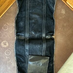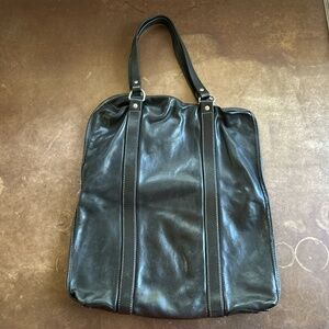 Guidi horse leather tote bag in black. Bought secondhand. Thick worn in leather with expected wear. There are tears where one strap meets the bag as pictured, but the hardware will keep it from tearing further. Hefty zippers open the bag completely flat. Unlined interior with one zip pocket.