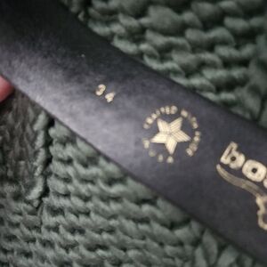 Stylish belt featuring a geometric pattern buckle. The buckle showcases red, black, and turquoise colors. Perfect for adding a unique touch to any outfit. Artist signed 3x2 belt included 34" leather
