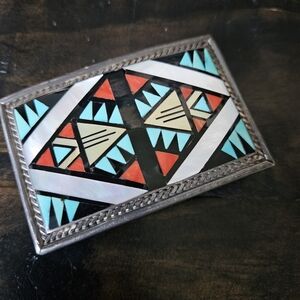 Vintage Zuni Inlay Stone and Sterling Silver 3x2 Buckle and Leather Belt