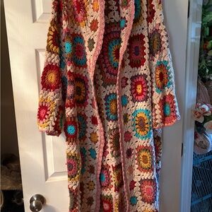 Embrace a burst of color with this stunning patchwork crochet cardigan. Perfect for adding a unique touch to any outfit.