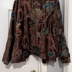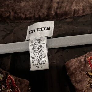 Chico's velvet jacket in rich brown. Features intricate embroidery in vibrant colors.