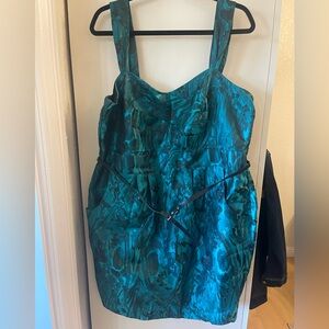 Elegant teal dress with black abstract pattern. Sleeveless design. Perfect for special occasions.